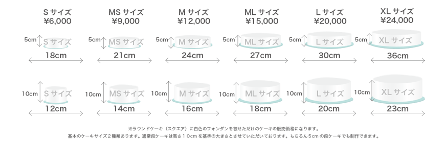ケーキの高さが5cmと10cmにより直径の大きさが変わります。