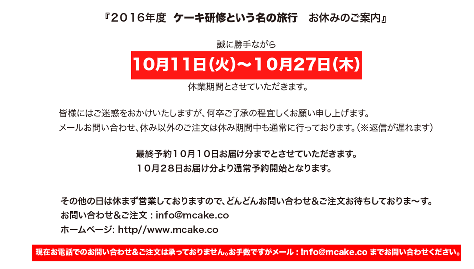 2016年度 ケーキ研修という名の旅行 お休みのご案内』